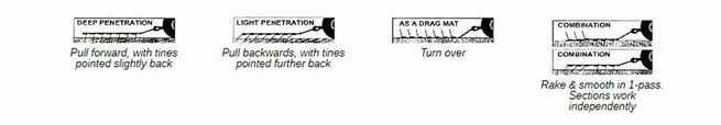 SUMMER – break up soil crusts on new seed beds without damaging young plants, rake pastures regularly to scatter manure droppings and stimulate grass growth, lift up crabgrass runners and heads so your mower can cut; rake & smooth dirt paths, gravel driveways and athletic fields.