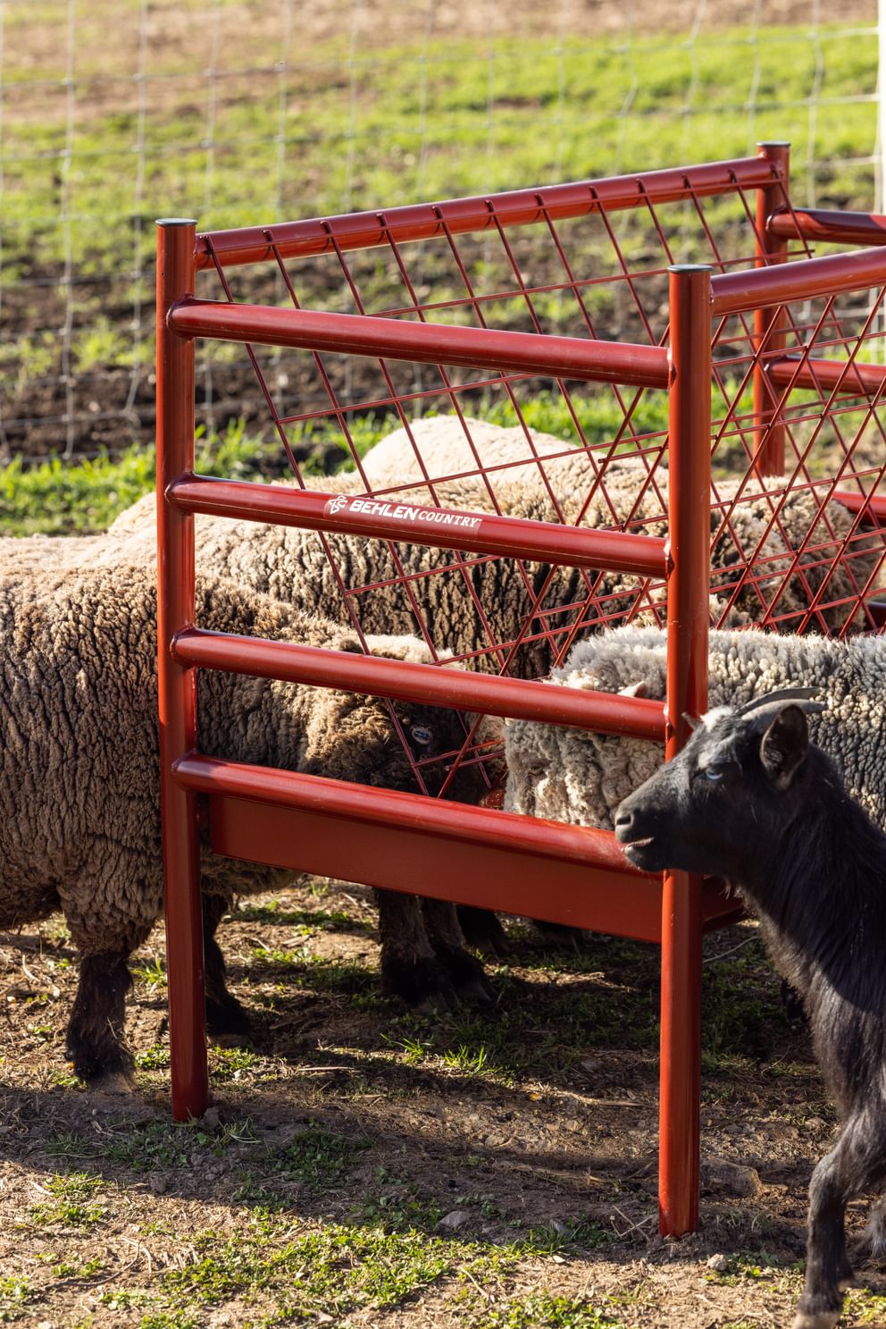 The all-metal form is made to withstand animal wear and tear. The product design and shallow feed pan deters animals from lying and climbing in while preventing feed from dropping to the ground. The hay rack is 4″x4″ gauge mesh.